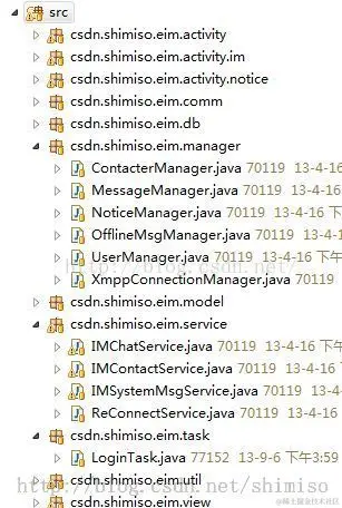 service中存放一些android后台的核心服务,主要包括聊天服务,联系人服务,系统消息服务,重连接服务