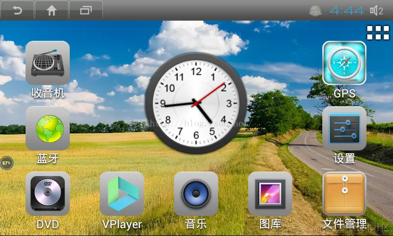 今天主要是分析修改Launcher的默认界面如何配置和修改。Launcher修改是最近才开始,下面两张图片是最近修改后的结果。因为程序是用于车载导航仪的,所以界面和一般的手机界面差别较大。改动也比较大,不过对于Launcher的分析修改都是通用的。