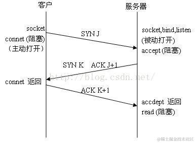 第一次握手:客户通过调用connect进行主动打开(active open)。这引起客户TCP发送一个SYN(表示同步)分节(SYN=J),它告诉服务器客户将在连接中发送到数据的初始序列号。并进入SYN_SEND状态,等待服务器的确认。