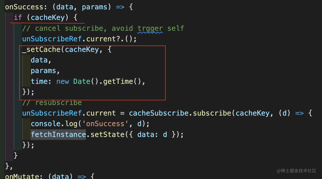 - onSuccess 和 onMutate 的过程是类似的,过程都是先取消订阅,设置 cache,再重新订阅。这个过程有点迷,单看一个 component 可能分析不出来,其实完整的描述过程是(场景假设是只触发了 A 的异步,B 是被动更新),先取消订阅 A 的 trigger 事件(这样之后 set cache,就不会触发 A 本身 ),set cache(这时候会触发 B 的 trigger),再重新订阅回 A 的 trigger 事件(这样如果之后在 B 那边触发了,A 也是走这么个流程)