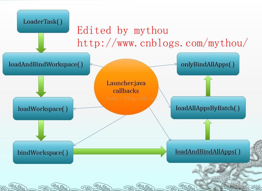 Launcher.java类继承了Callbacks接口,并实现了该接口。LauncherModel里面会调用这些接口,反馈数据和状态给Launcher。数据加载总体分为两部分,一部分是加载workspace的数据,另一部分是加载All APP界面的数据。