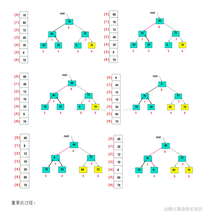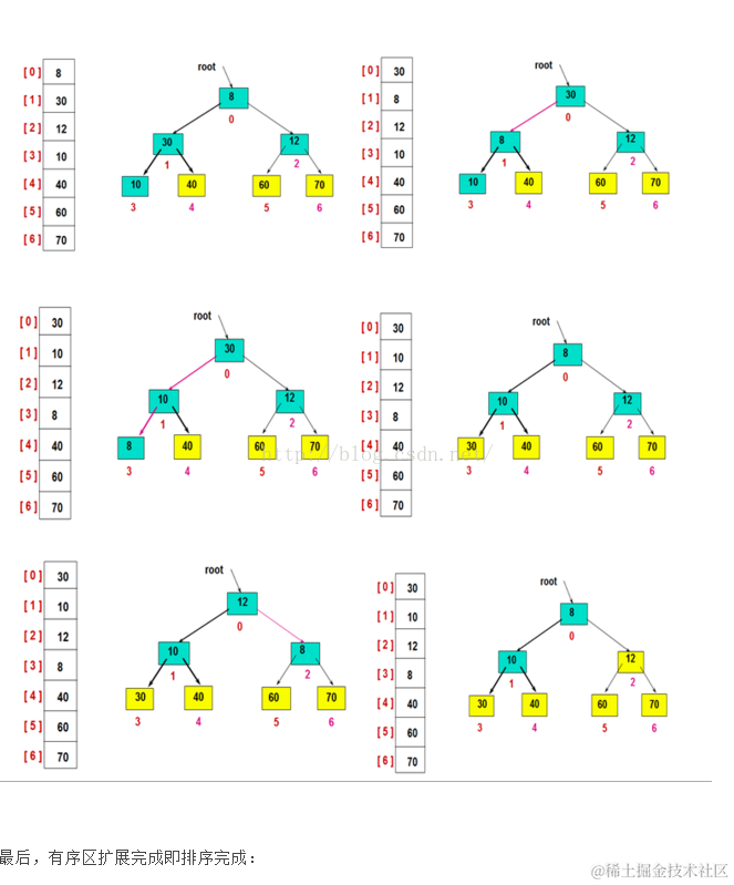 然后,交换堆顶的元素和最后一个元素,此时最后一个位置作为有序区(有序区显示为黄色),然后进行其他无序区的堆调整,重新得到大顶堆后,交换堆顶和倒数第二个元素的位置……\