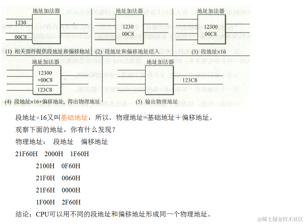 地址加法器采用“段地址×16+偏移地址”的方法合成物理地址。即:段地址×16+偏移地址=物理地址。