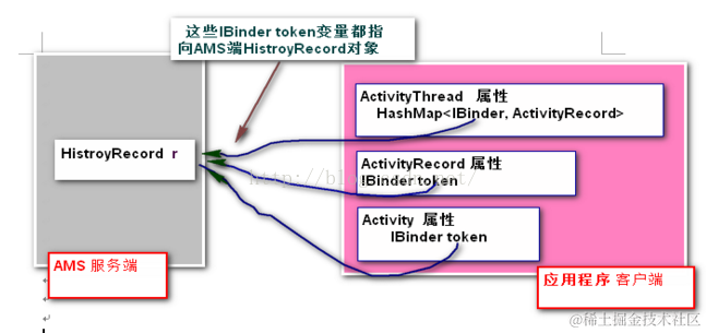 实际上指向的的ActivityManagerService的HistoryRecord对象,他们是一一对应的。在应用程序内部和AMS都通过该token