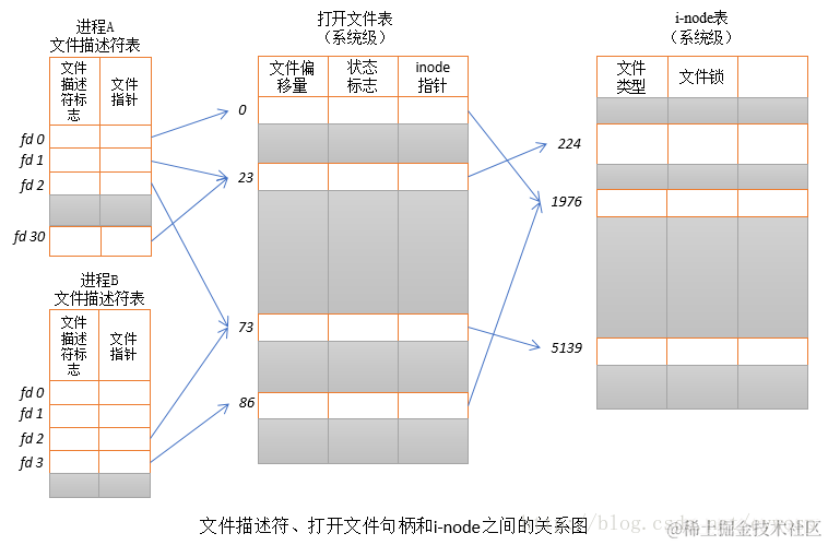 在进程A中,文件描述符1和30都指向了同一个打开的文件句柄(标号23)。这可能是通过调用dup()、dup2()、fcntl()或者对同一个文件多次调用了open()函数而形成的。
