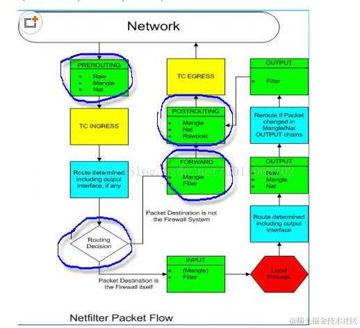 这里可以看出 Netfilter 处理网络包的先后顺序:接收网络包,先 DNAT,然后查路由策略,查路由策略指定的路由表做路由,然后 SNAT,再发出网络包。