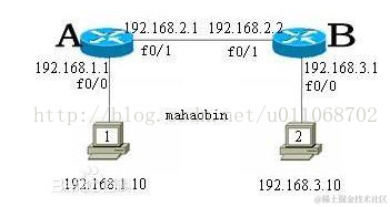以上面的拓扑结构为例,在没有配置路由的情况下,计算机1 和 2 无法互相通信,因为 1 发给 2 的包在到达路由器 A 后,它不知道怎么转发它。B 也同样。管理员可以配置如下的静态路由来实现 1 和 2 之间的通信: