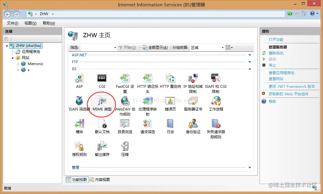 注:本文在win8环境下IIS7版本中填写的MIME类型,在IIS6、IIS7 MIME类型管理所处位置不一样,但是添加方式和参数均相同。