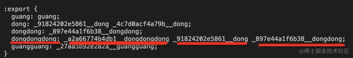用 :local 这样的伪元素选择器包裹的 css 会做选择器名字的编译,并且把编译前后的名字的映射关系放到 :export 这个选择器下。