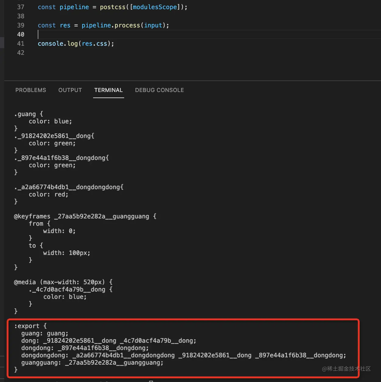 这样 css-loader 调用 postcss-modules-scope 完成了作用域的编译之后,不就能从 :export 拿到映射关系了么?