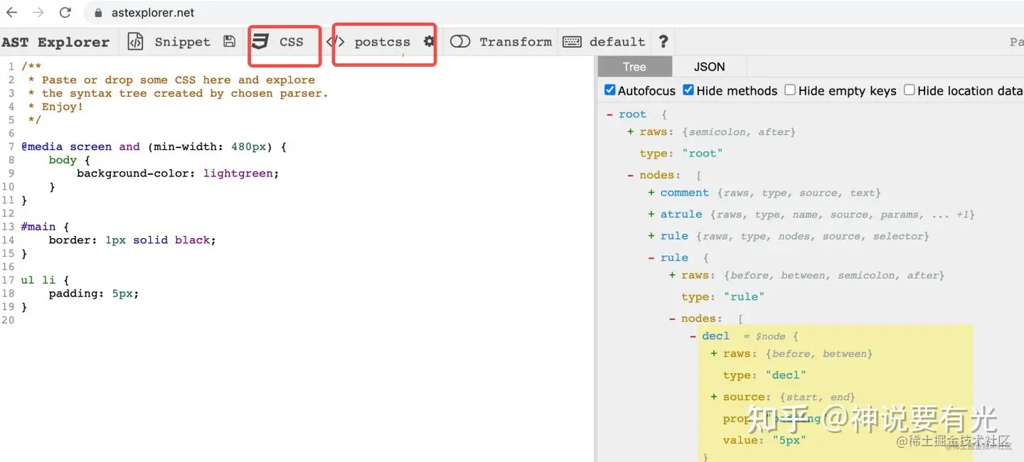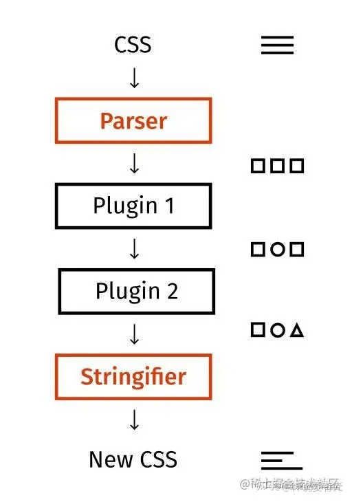 postcss 完成了从 css 到 AST 的 parse,和 AST 到目标代码和 soucemap 的 generate。我们在插件里只需要完成 AST 的转换就可以了。