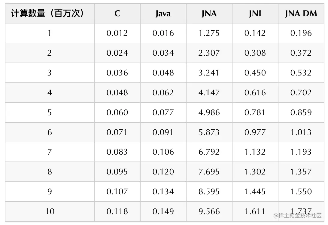 我们通过如下实验简单做了一下性能对比,我们分别用C语言、Java、JNI、JNA以及JNA直接映射五种方式,分别进行100万次到1000万次的余弦计算,得到耗时对比。在6核16G机器,我们得到如下结果: