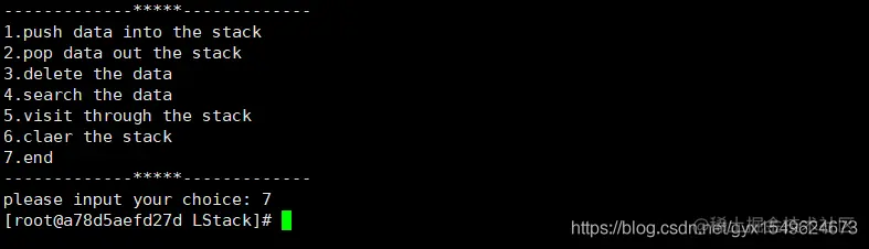 7.clear功能 键入6,执行clear操作,将栈清空,截图如下