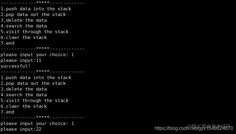2.push功能 键入1,执行push操作,依次入栈11 22 33 55 66 77 88,然后选择5,遍历输出此时的栈,验证push确实成功。运行截图如下。