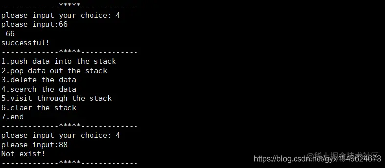 5.search功能 键入4,执行search操作,用于搜索一个元素,实例中搜索栈中元素66显示成功,搜索非栈中元素88显示not exist。实验截图如下: