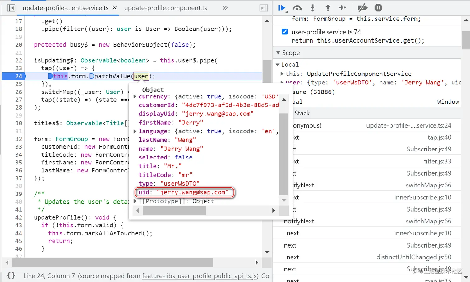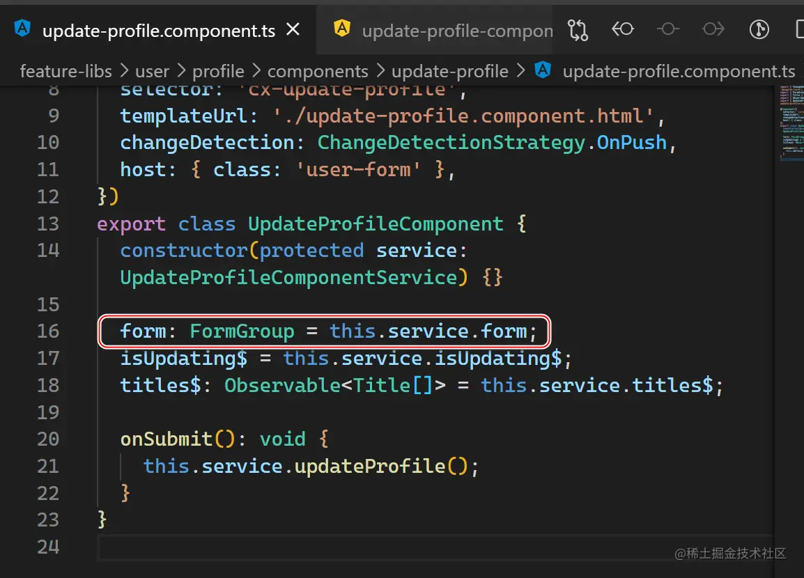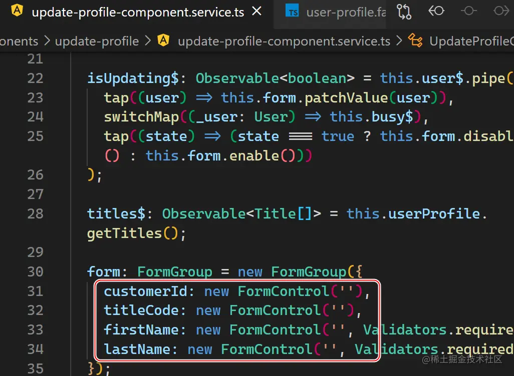 service 的 form 什么时候赋的值呢?在 Service class 里复制,没有使用 form builder,而是 手动创建 FormGroup 实例。该 FormGroup 构造函数,接收的参数为 JSON 对象,key 为绑定到 HTML 里的控件名,值为这些控件的初始值。