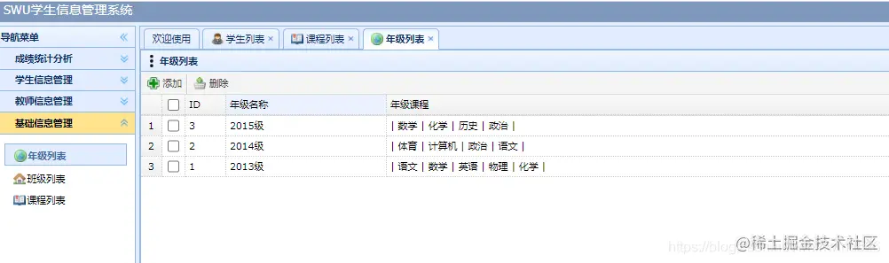 管理员:进入系统可以进行 学生管理,教师管理,基础信息管理(年级管理,班级管理,课程管理),系统管理,成绩统计分析管理等。管理员用户在user表中type类型为1 的用户。