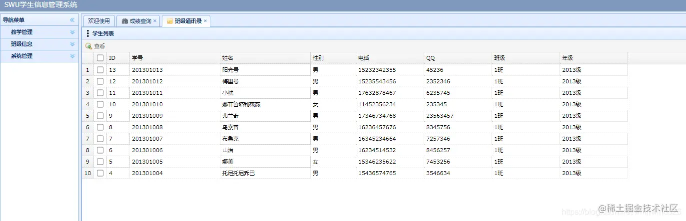学生用户:进入系统可以 查询考试成绩,查看班级通讯录,修改个人信息等。学生用户在user表中type类型为2 的用户。