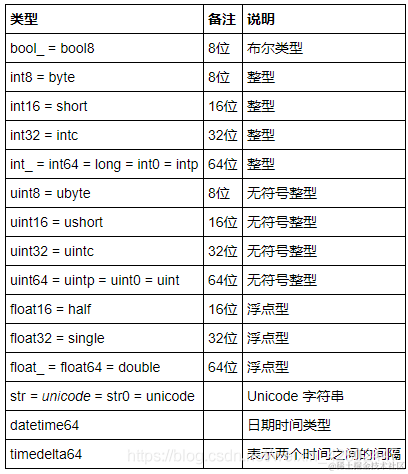 numpy学习(2)---数据类型 浪里摸鱼 2022-04-26 56 阅读1分钟 为了适应科学计算的要求,numpy有一些不同于Python的数据类型 numpy的数据类型是dtype对象的实例,每个内建类型都有一个唯一定义它的字符代码 使用方法: python的浮点数是64位 = np.float64 python的整数型不会溢出,numpy会溢出