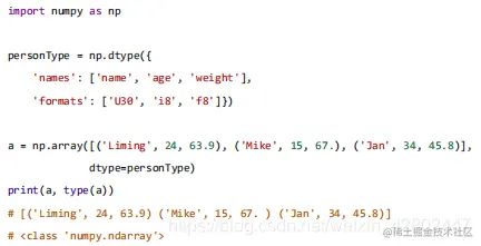 使用参数 dtype 为定义的结构,np.array() 来创建数组
