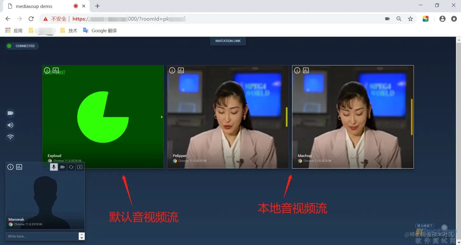 上图可以看到,一个浏览器就是一个用户,最直观的做法就是同时多台电脑浏览器接入视频会议,然后打开摄像头和麦克风输入视、音频流。