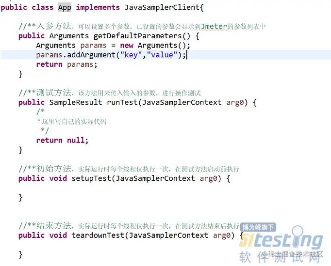 在我们的测试类中继承JavaSamplerClient接口类,并实现该父类的4个方法。