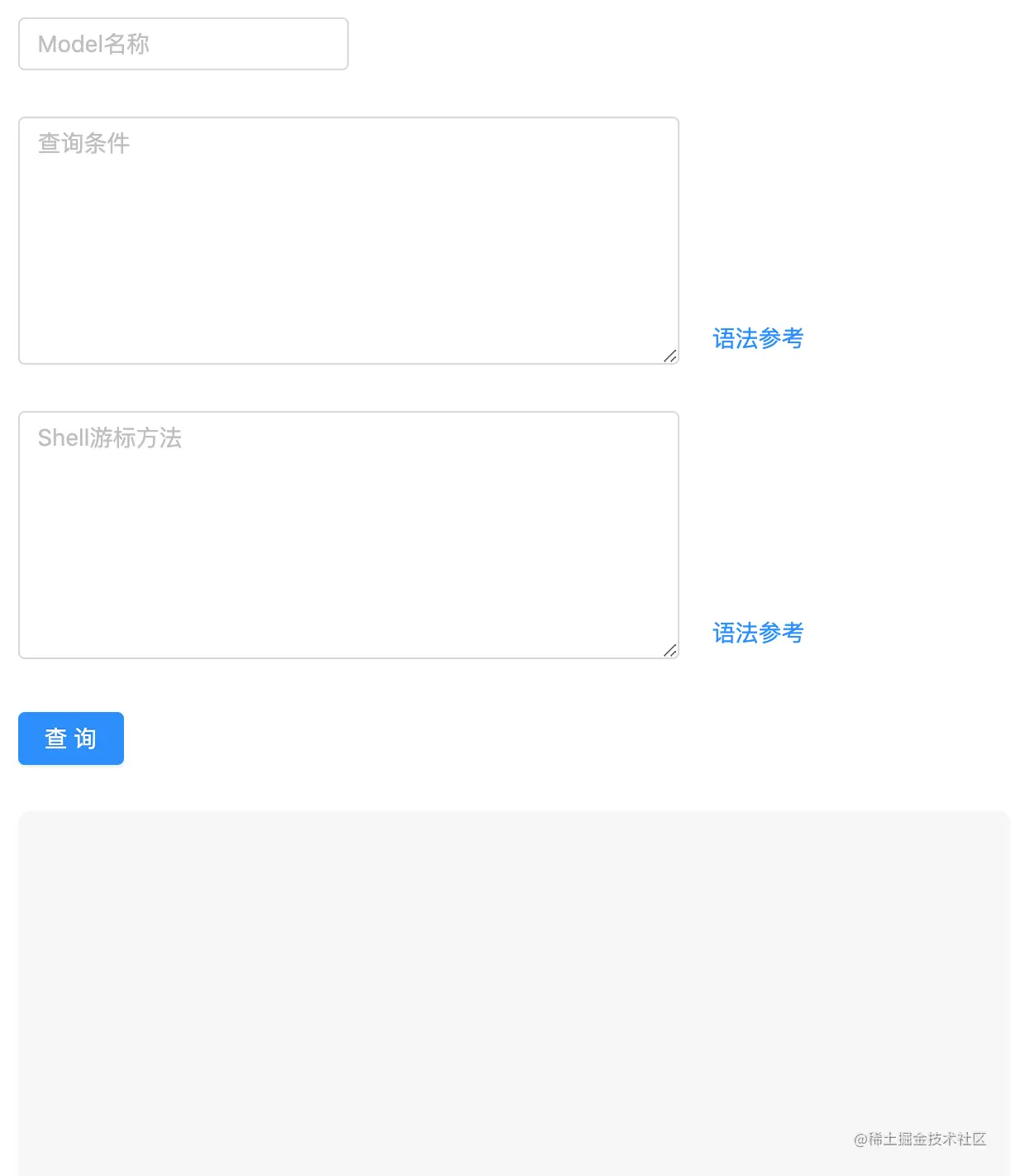 界面中需要传入一个Model名称,多行文本中只要传入 where 条件即可,语法参考的是 db.collection.find(),下图灰色使用了 <pre> 标签,为了能在页面中显示空行和换行。
