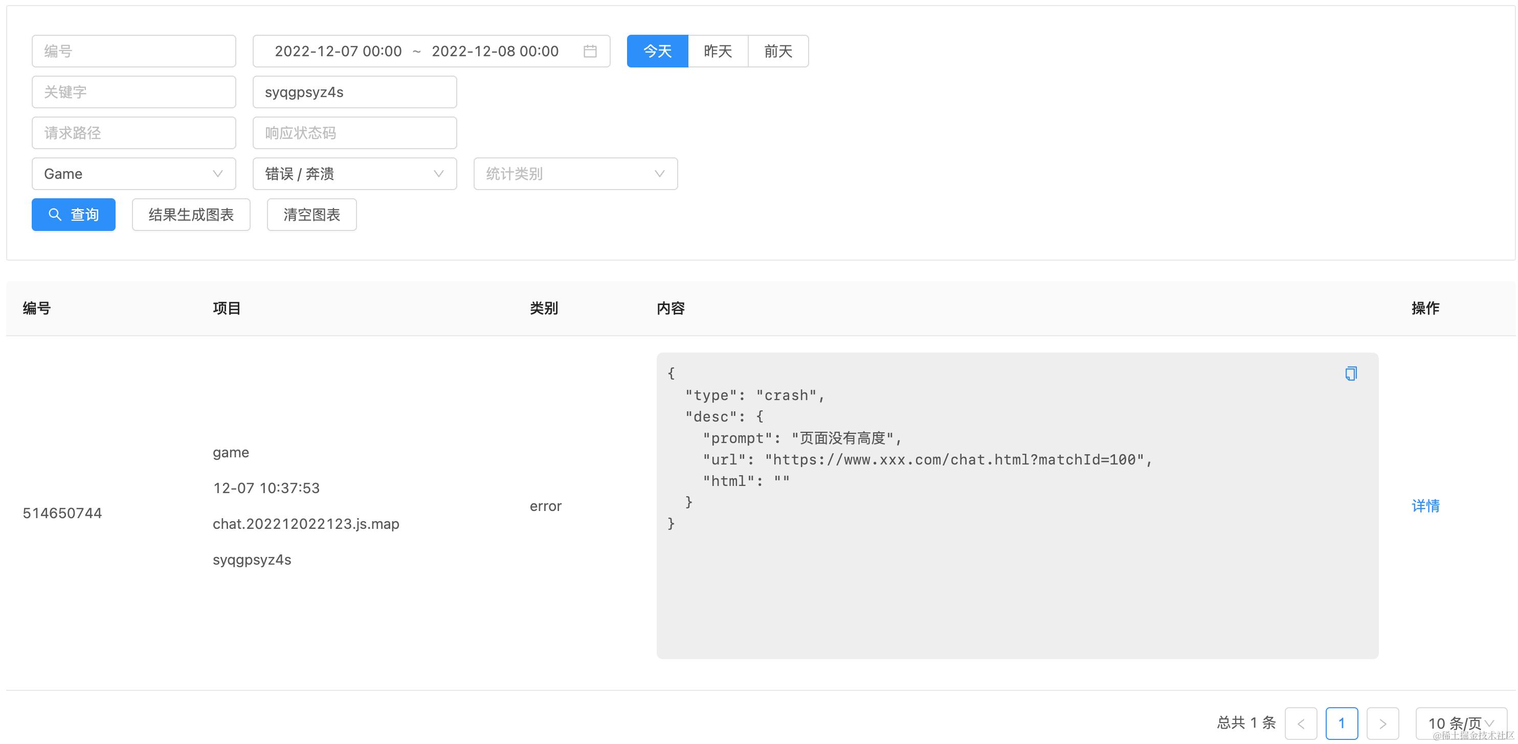接下来就是验证上报的白屏是否准确,下面是上报的一条记录,它有一串字符身份信息,例如 syqgpsyz4s。