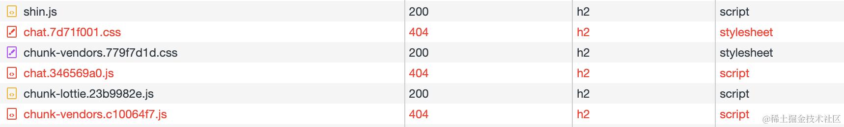 但是当我直接请求 url 地址时,却发现有 3 个资源的请求是 404,与正常页面中的 3 个资源做比对,发现两者的随机后缀是不同的。