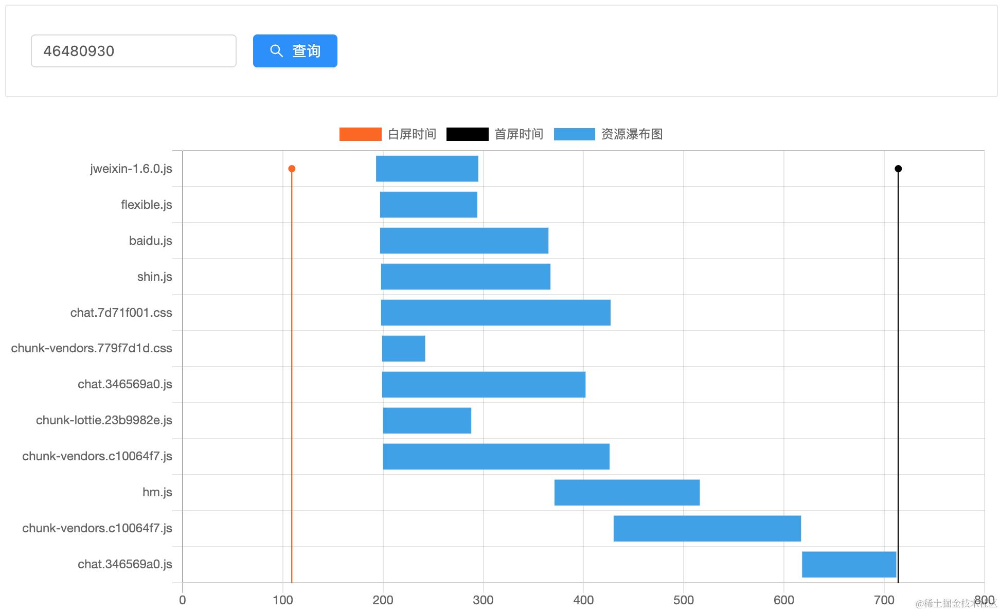 再根据此身份去查询性能监控的记录 ID,找出当时静态资源的瀑布图,在此图中,并没有发现资源异常。