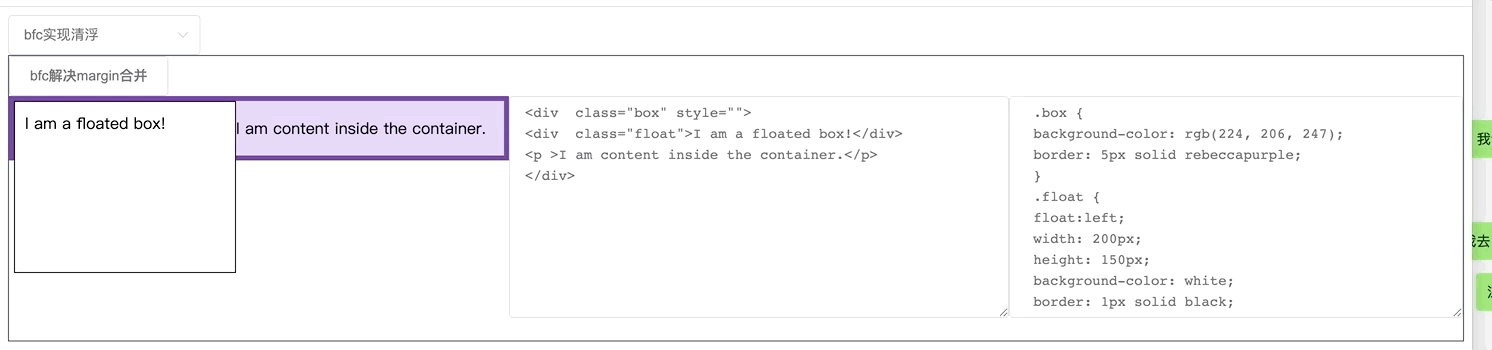 解读: 原始样式,会出现上下边距合并现象;点击后将下内容包裹在另一个 bfc中,从而解决 margin合并问题