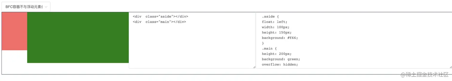 - 又如两列左定宽右自适应布局,在 BFC中,存在规则BFC容器不与浮动元素合并,那我们就可以设置左定宽元素为浮动元素,右自适应元素为 BFC元素即可