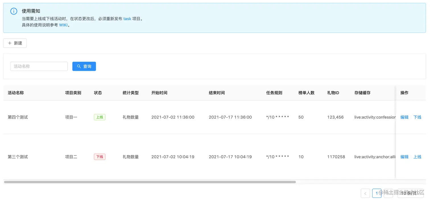 得益于之前抽象出了一套通用模板组件,这个页面只花了两个半小时就搭建好了,包括后端接口和列表页面,在列表页面可控制活动的上下线。