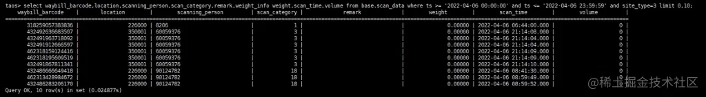 select waybill_barcode,location,scanning_person,scan_category,remark,weight_info weight,scan_time,volume from base.scan_data where ts>='2022-04-07 00:00:00' and ts<='2022-04-07 23:59:59' and site_type=3 limit 0,10;