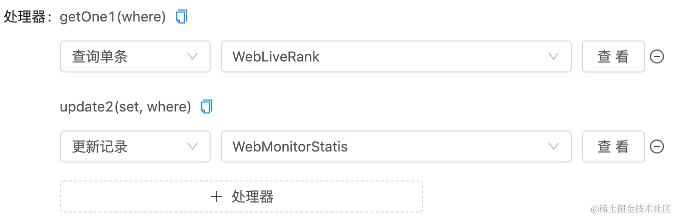 参数是可以动态配置的,处理器也是一样,并且在选中方法后会显示方法名和方法参数,而在选好Model文件后,会出现查看按钮。