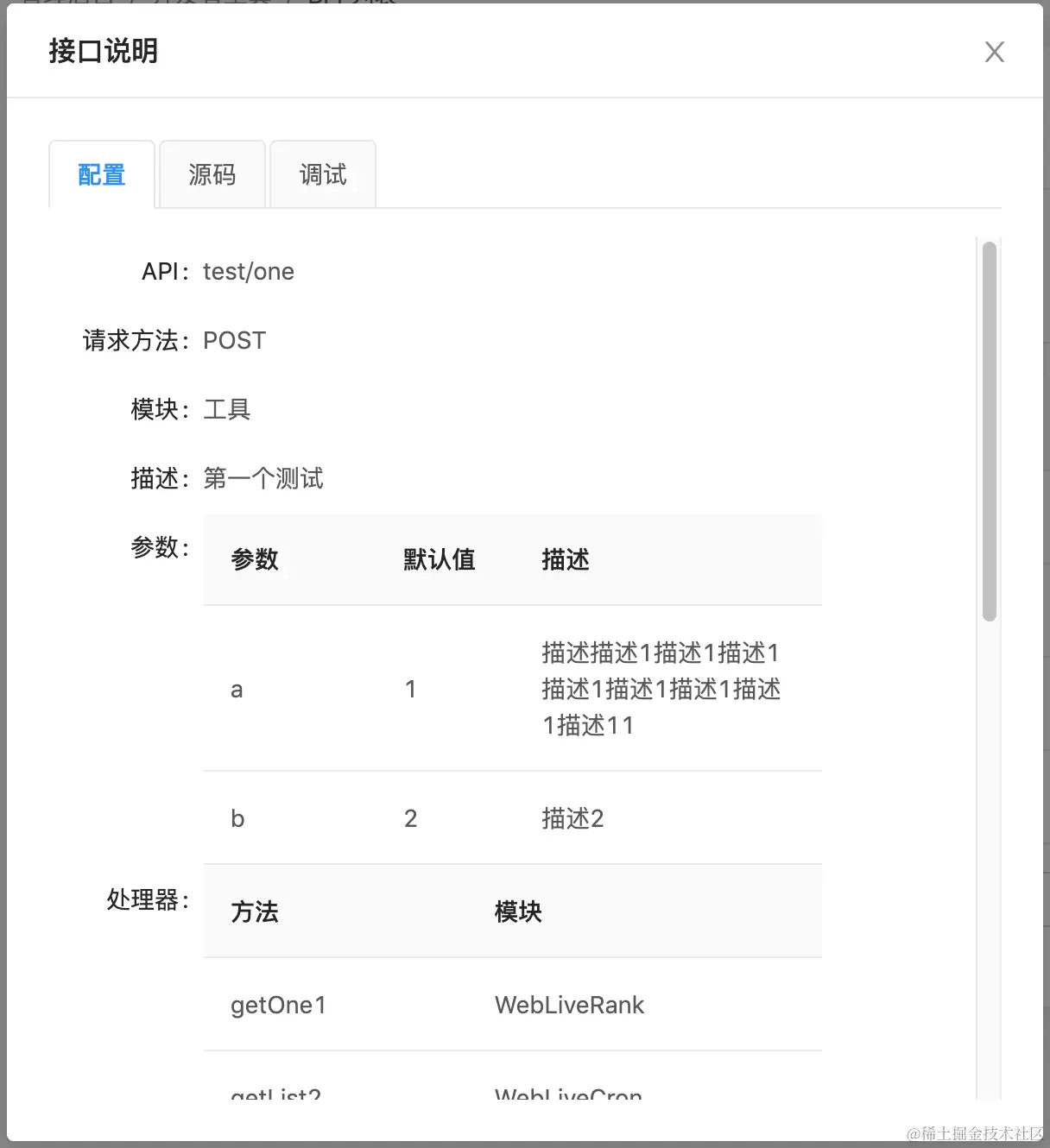 列表页面的状态不会受跳转的影响。点击查看会出现配置信息、源码和调试界面,这些配置信息就是接口文档,并且还能随时调试。
