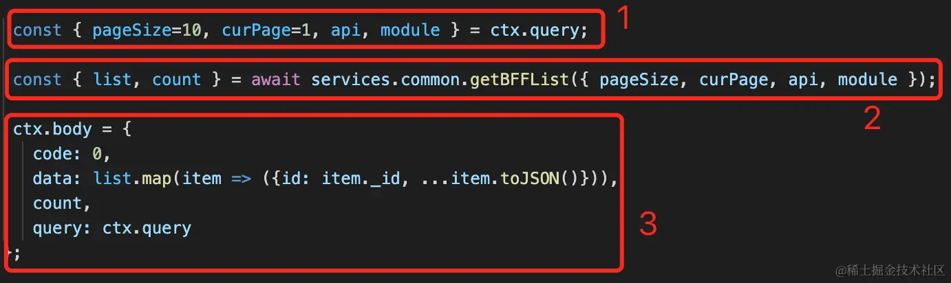 当前80%的Node接口代码复杂度都并不⾼,基本都是机械化重复的,这些接口可分为三部分:参数处理(1)、服务调用(2)和响应聚合(3),类似于下图。