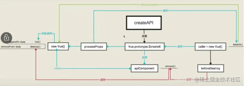 创建过程:根据传入的参数做一些处理,如processProps。之后就会新建一个vue实例,它的child就是实例组件。在执行vue实例初始化的过程中首先执行init()方法(append to body将组件的DOM添加到body下,这也是它可以动态挂载到body的原因)