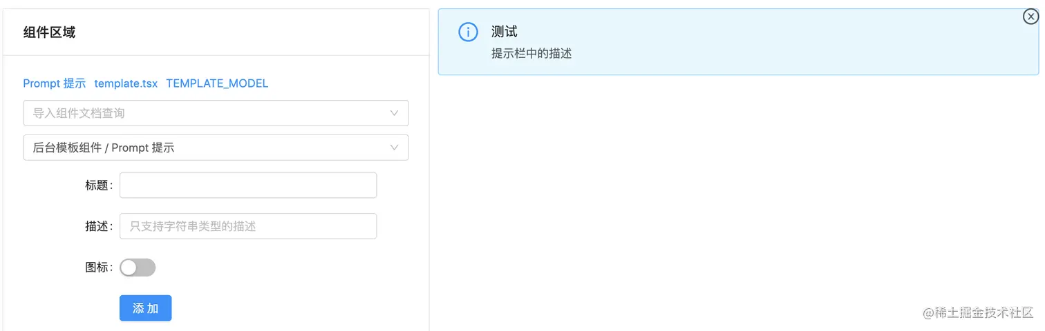 第二个下拉框能选择页面中需要的组件,例如图中的提示组件,点击添加后会在右边显示,并且还会提供一个删除图标,目前暂不支持拖动效果。