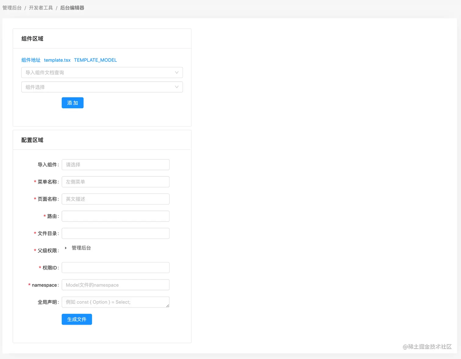 在配置区域中,可以输入菜单名称、路由、文件目录和权限等信息。