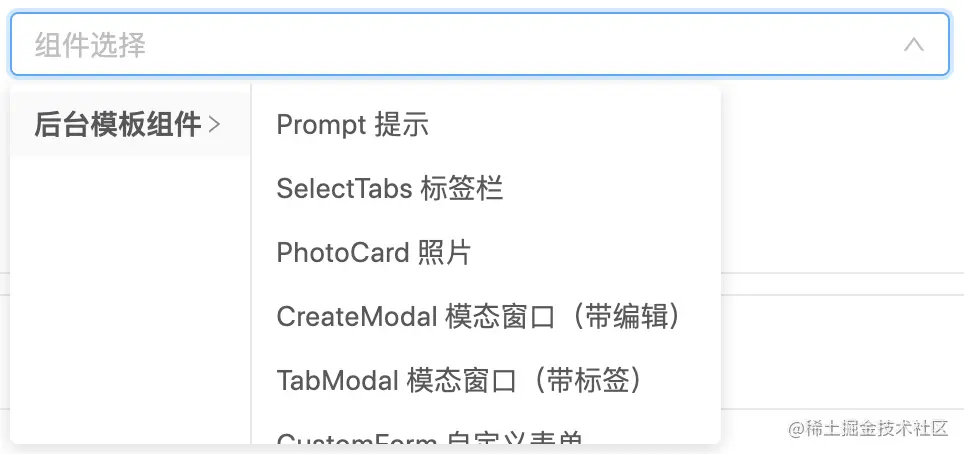 组件区域的第一个下拉框可以选择Ant Design和部分模板组件,选中后,会替换组件地址的链接,点击就能跳转到组件的说明文档。