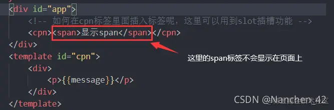 这里想要直接获取cpn中的span元素。但是这样并没有达到我们所期望的效果,如果想要实现这种效果就要用到插槽