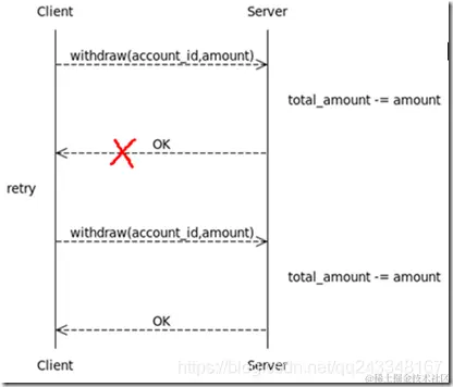 withdraw的语义是从account_id对应的账户中扣除amount数额的钱;如果扣除成功则返回true,账户余额减少amount;如果扣除失败则返回false,账户余额不变。值得注意的是:和本地环境相比,我们不能轻易假设分布式环境的可靠性。一种典型的情况是withdraw请求已经被服务器端正确处理,但服务器端的返回结果由于网络等原因被掉丢了,导致客户端无法得知处理结果。如果是在网页上,一些不恰当的设计可能会使用户认为上一次操作失败了,然后刷新页面,这就导致了withdraw被调用两次,账户也被多扣了一次钱。如图1所示: