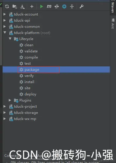 2.使用idea打开tduck-platform后端代码,双击package打包生成tduck-api.jar包。