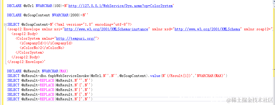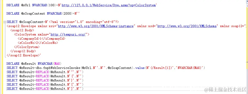 DECLARE @sUrl NVARCHAR(100)=N'http://127.0.0.1/WebService/Dye.asmx?op=ColorSystem'