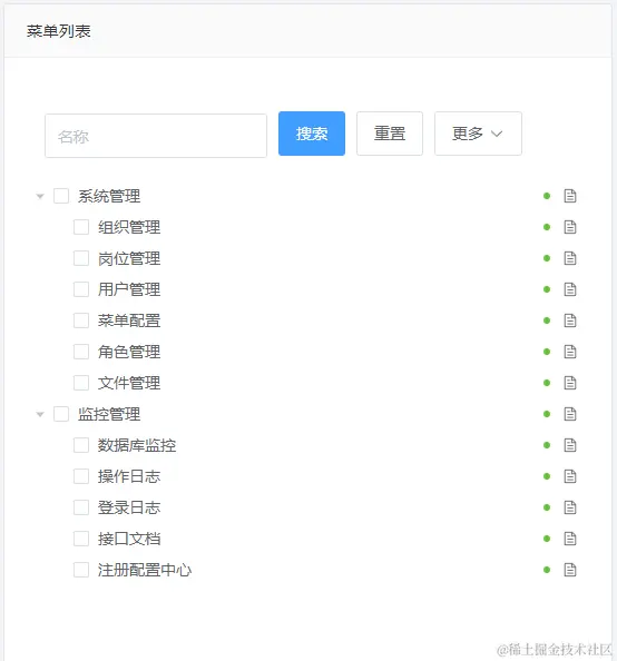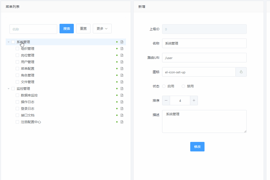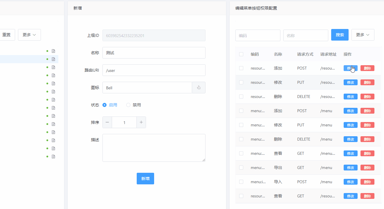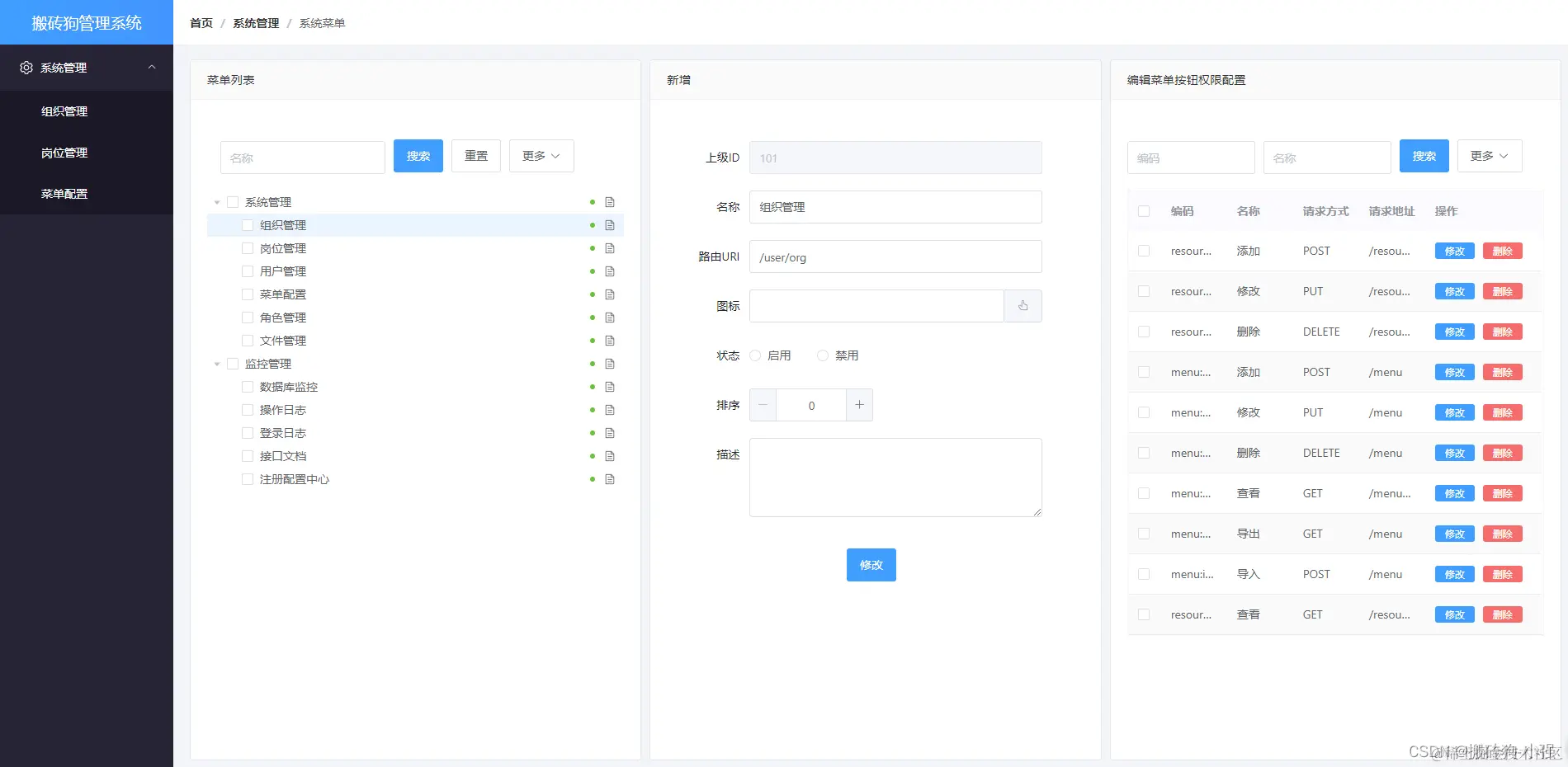 菜单管理是一套系统中最常见最核心的系统管理模块之一,我把菜单管理分成了2个部分,左边可以管理维护菜单,在菜单的最右侧可以维护每个菜单按钮权限配置