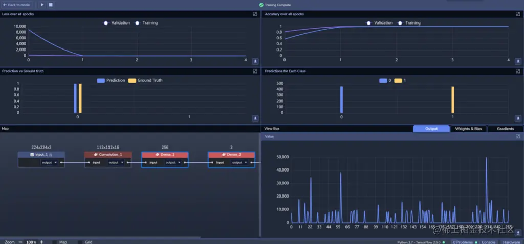 我们使用 ADAM优化器、0.001的学习率和Cross Entropy损失函数,对模型进行了5次历时的训练,每批32次。训练时间约为22分10秒,我们的训练准确率为100%,验证准确率为99.7%。图3是PerceptiLabs在训练中的统计视图。