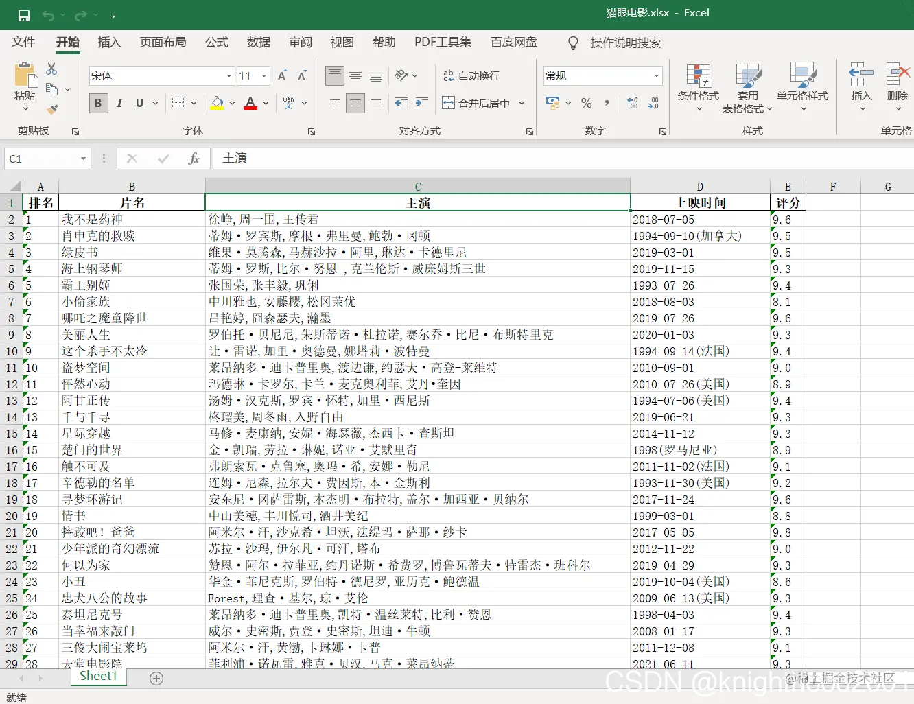 columns = ['排名', '片名', '主演', '上映时间', '评分']