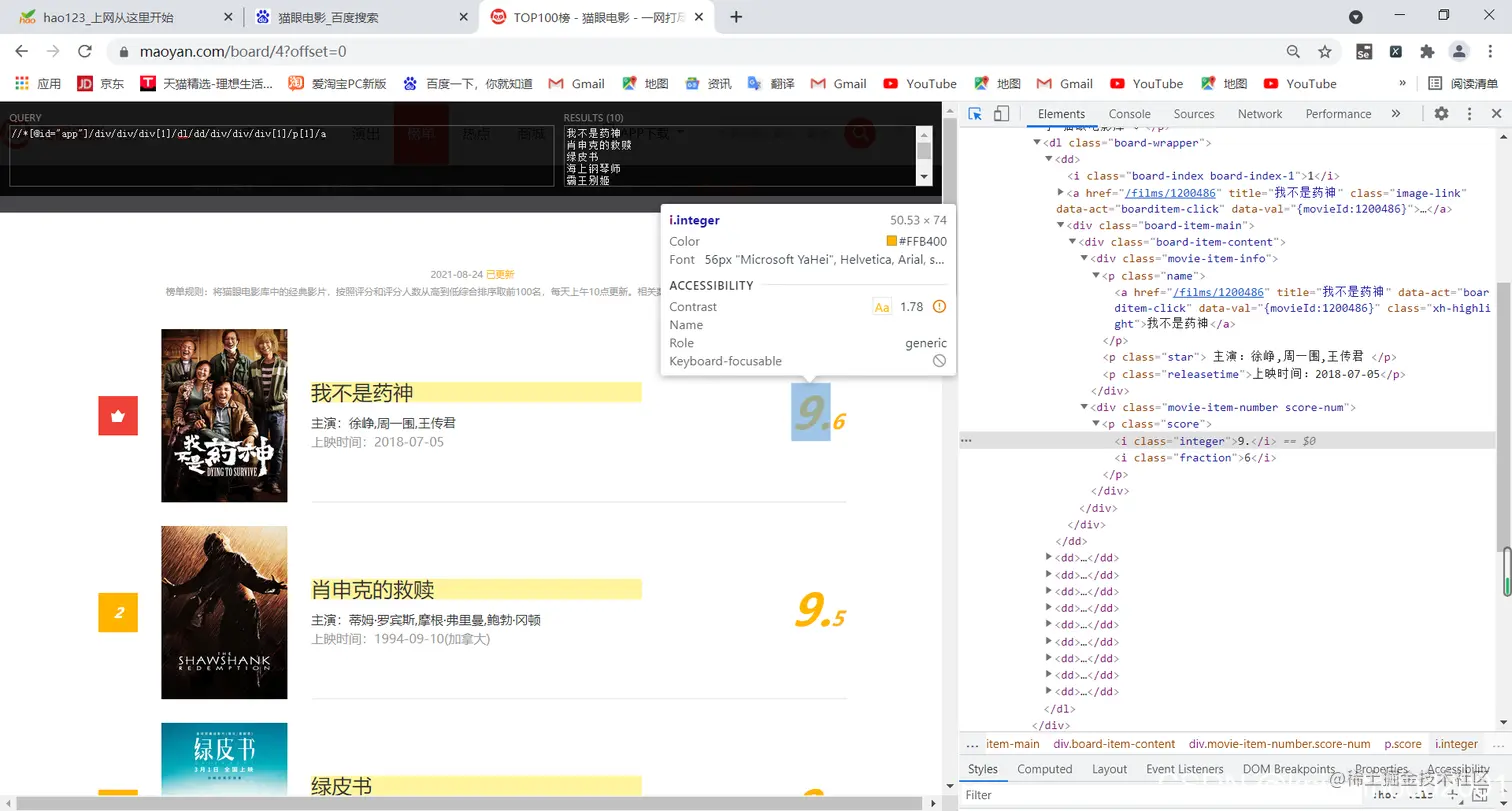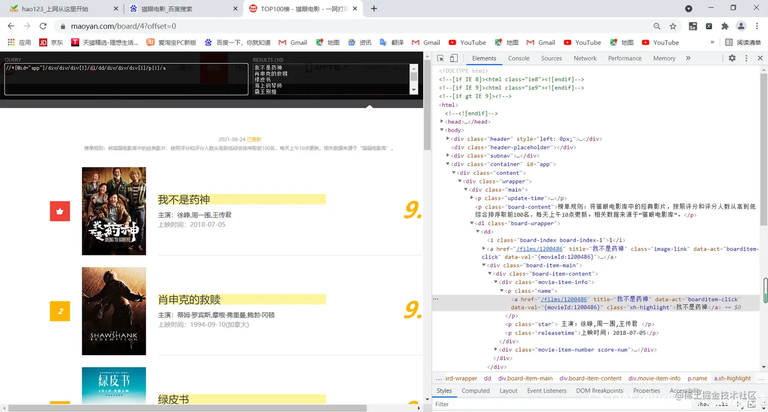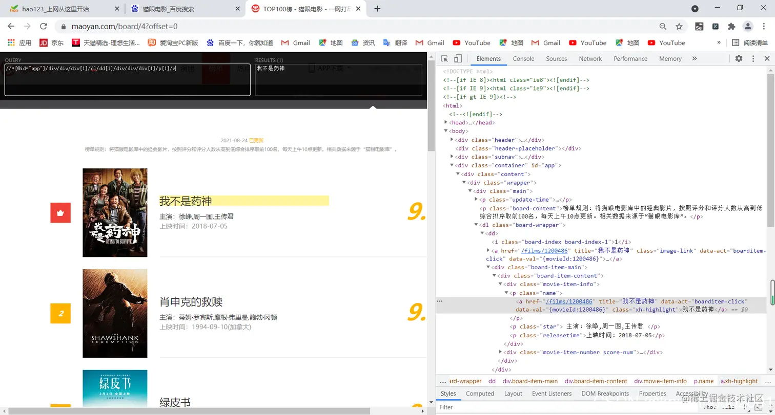 可以将xpath在浏览器中试试看,例://*[@id="app"]/div/div/div[1]/dl/dd[1]/div/div/div[1]/p[1]/a的结果为 我不是药神,分析节点,若删除dd后的[1],最终结果就是该页面所有片名,