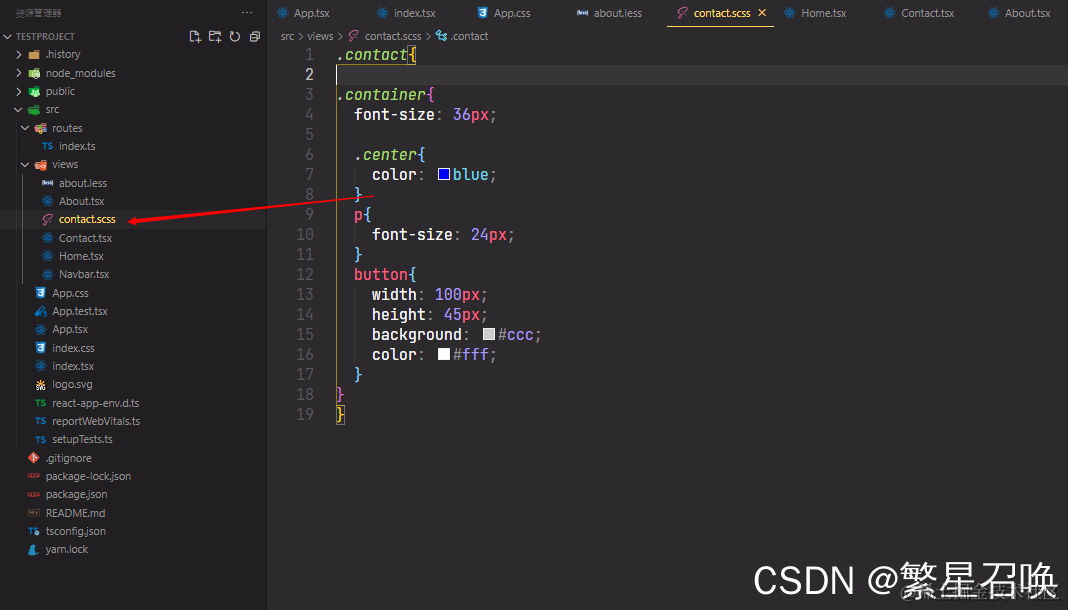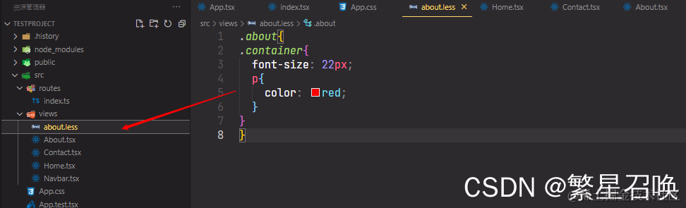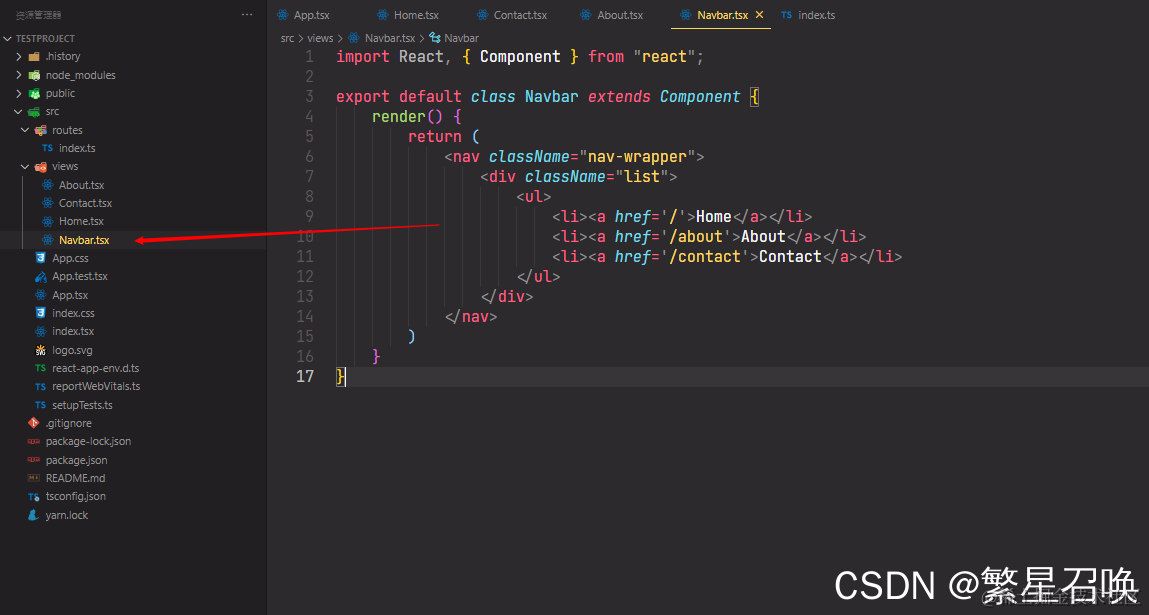 src目录下创建views文件夹,views内创建Home,Contact,About,Navbar四个tsx文件,其中Navbar用来控制路由,其他三个页面用来展示